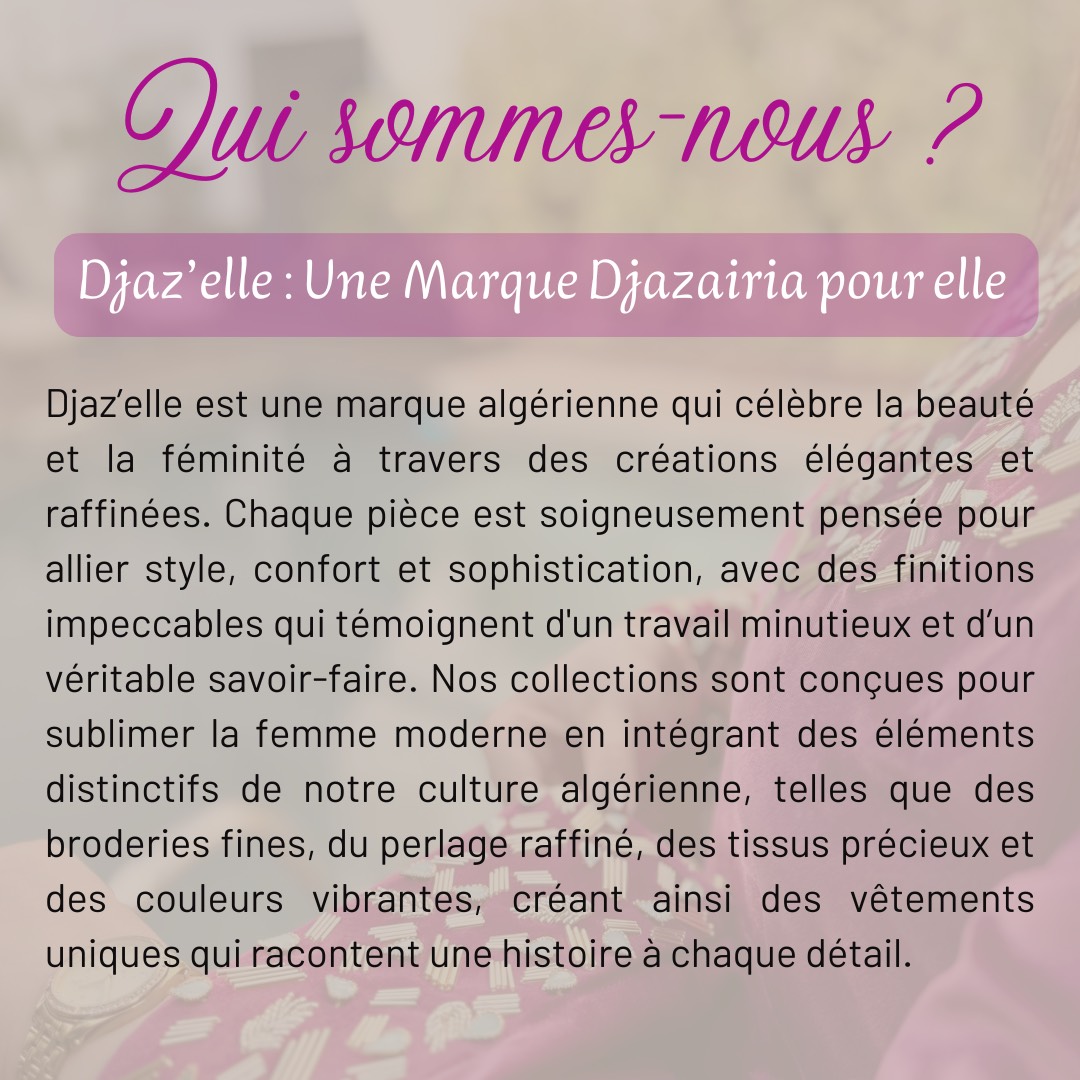 Des matières nobles, des broderies fines et un perlage soigné : chaque pièce Djazelle reflète l’élégance et la qualité jusque dans les moindres détails.